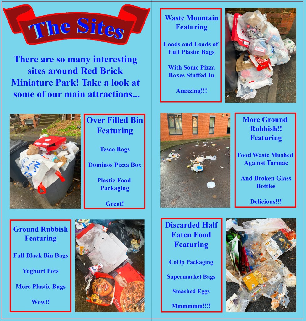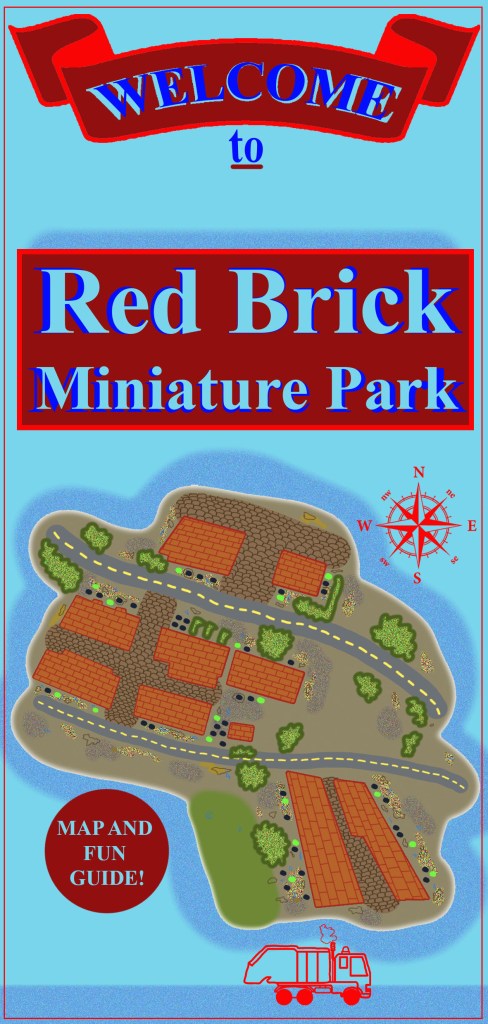The sites are all disgusting scenes of waste. I was comically pretending that they are a kind of ‘selling point’, attracting visitors to “Red Brick Miniature Park”. While showing the pictures of real grimness that inspired this idea in the first place.